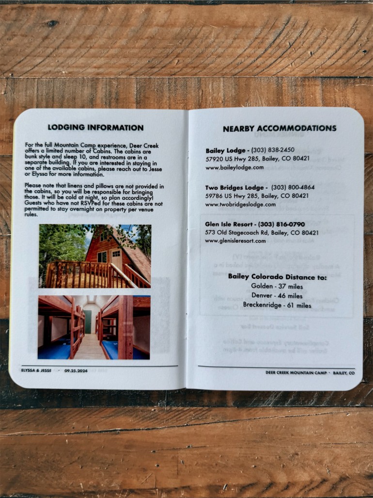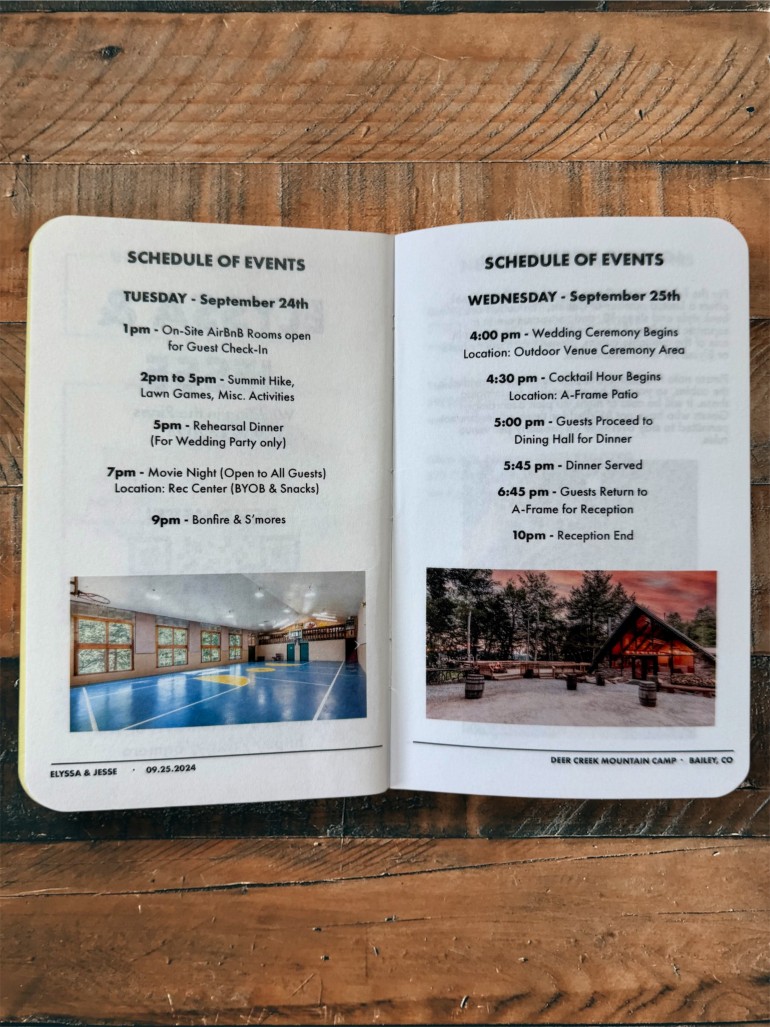 • Special edition day-of pamphlet—detailing the wedding party, menu, vendors, and timeline.