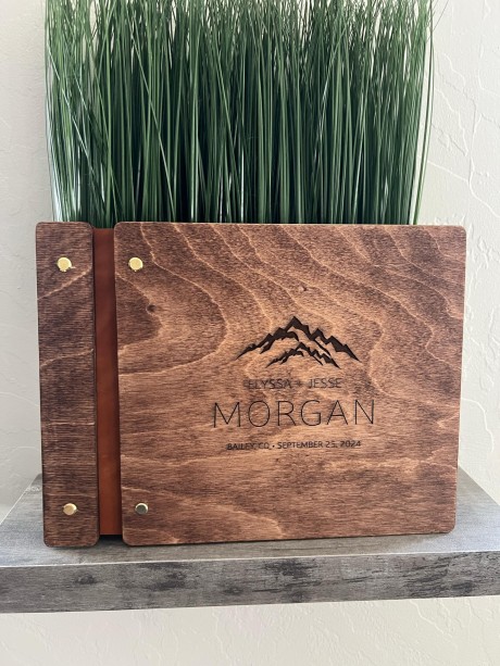 • Custom engraved wooden guest book