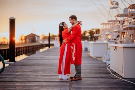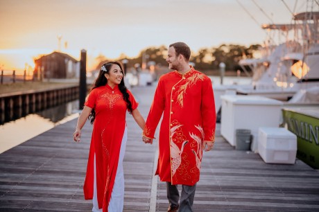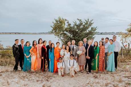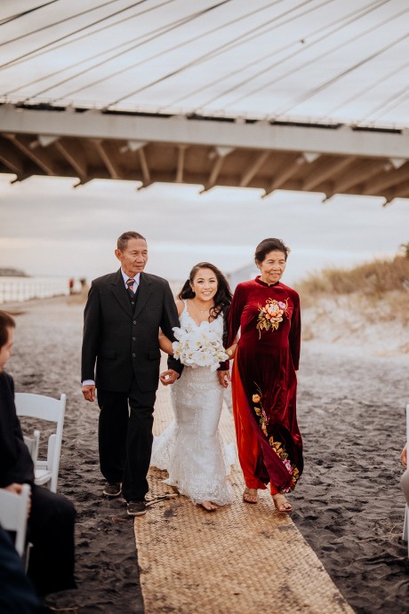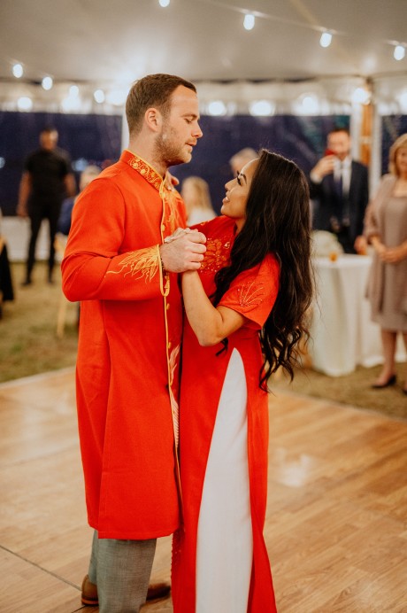 The bride’s family wore traditional Vietnamese garments (“Áo dài”), which the couple also changed into for their reception.