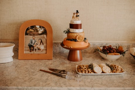 Rather than a traditional cake, the couple opted to create a "cheese cake" made of stacked wheels of various cheeses in different sizes.