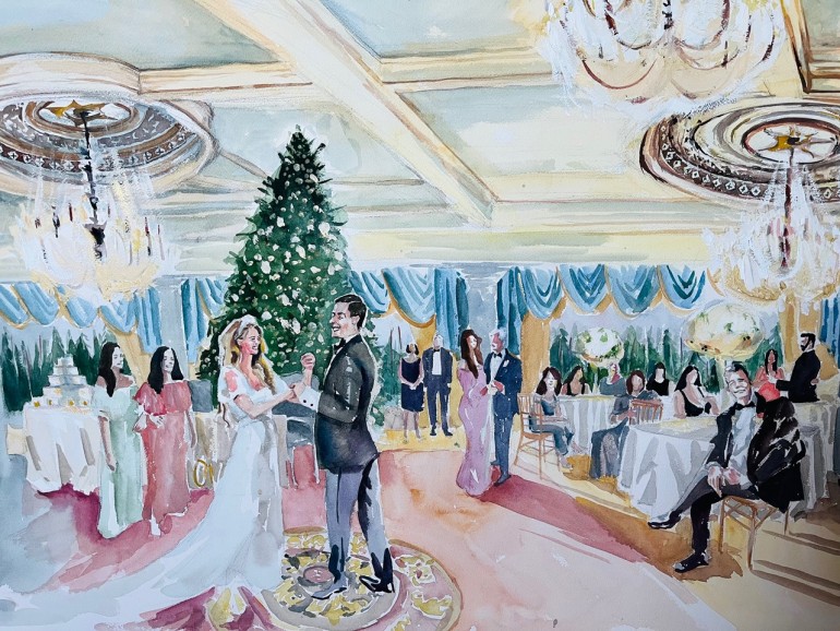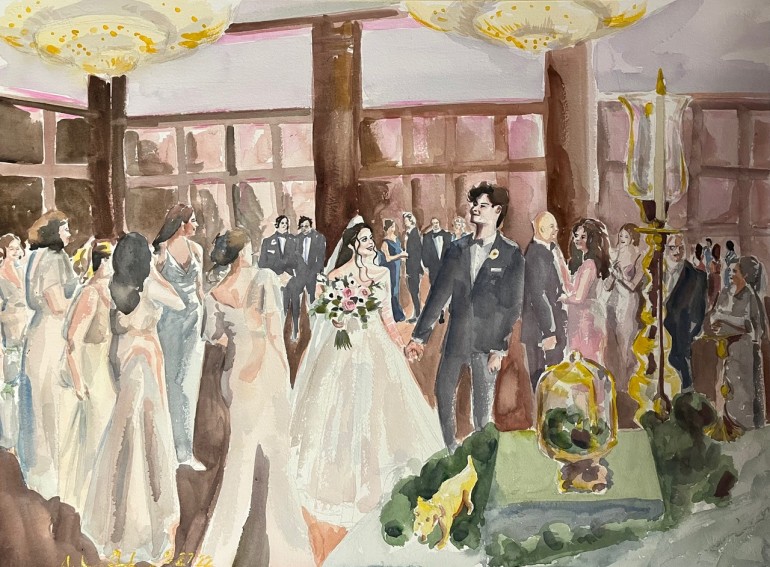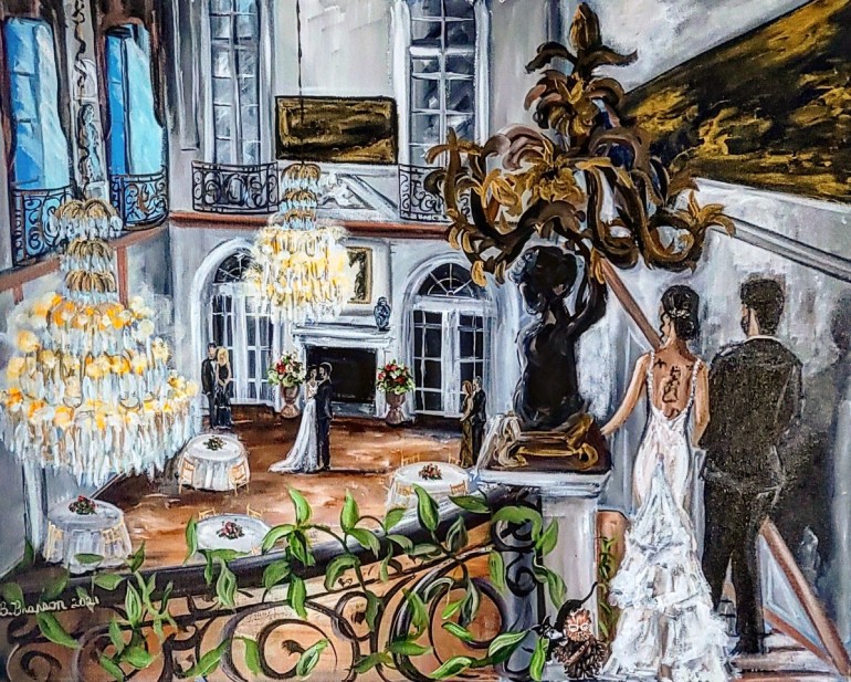 “Many of my couples love their venue’s ceremony space but ultimately want their first dance painted. And so I’ll often paint them in a first-dance pose, but within the ceremony space,” said Brittany. “That way, both elements that they love are cohesively captured together.”