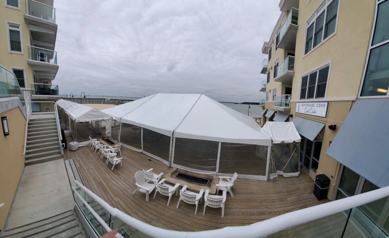 Below are a few shots of tents installed on the deck at Lighthouse Cove/Hyatt Place Dewey, showing the panoramic view of Rehoboth Bay.