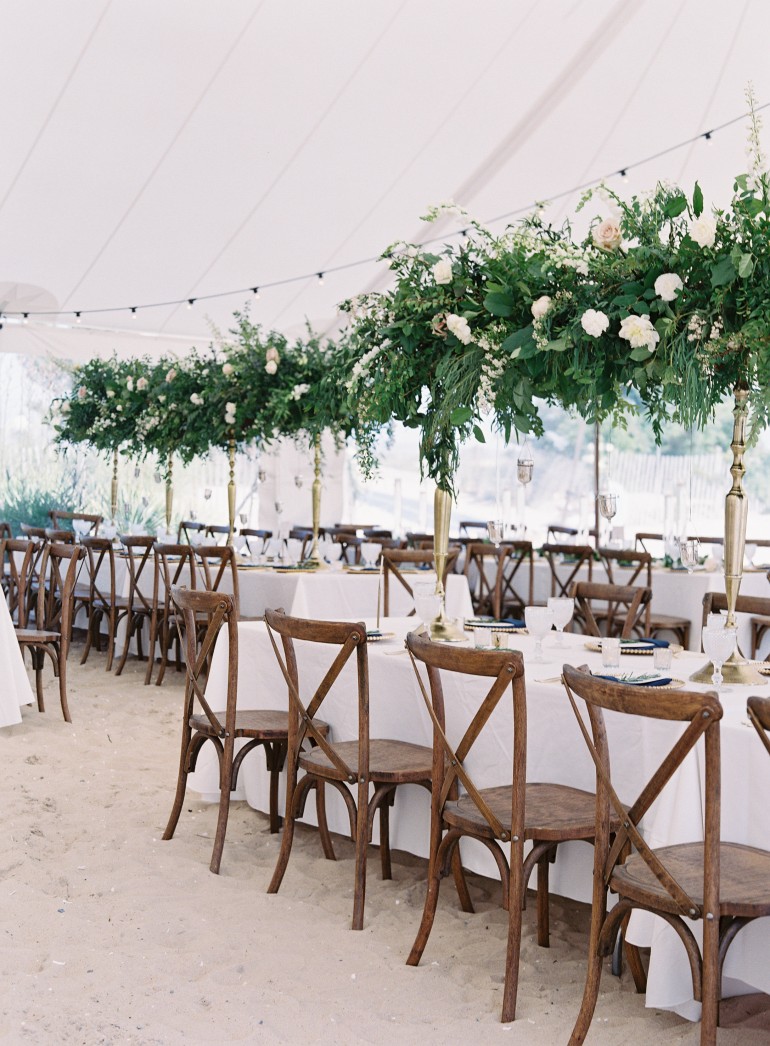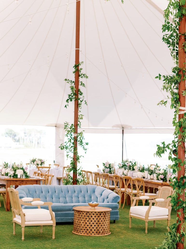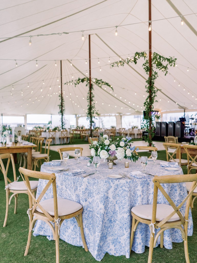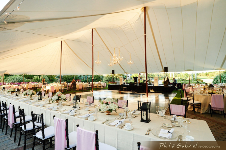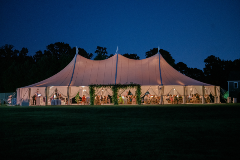 Check out Meghan + Matt’s gorgeous Sailcloth Wedding by Collective Event Group, held at Baywood. Below are a few vantage points of the tent exterior and tent interior and set up! They selected black chiavari chairs and mixed round and king-width banquet tables for seating. You can view our chair rental selections, perfect for your Delaware Wedding here!