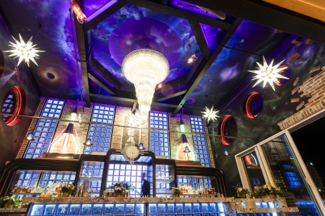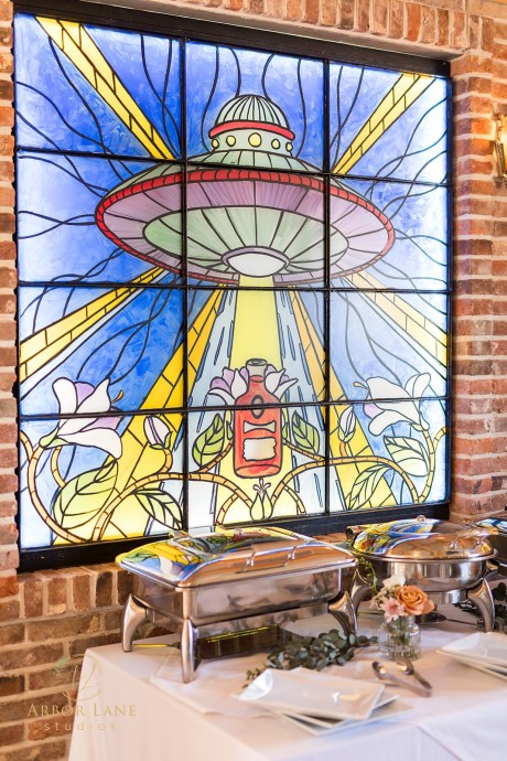 Area 51 is located on the top floor of the Atlantic Beverage Center, and from the road, at night you might catch a glimpse of the impressive chandeliers and stained glass sparkling in a tantalizing hint of what the space has to offer. A serendipitous amalgamation of Art Deco, antique space-themed elements, and exposed brick, the “out of this world” concept is truly must-see. The attention to detail is spectacular, specifically the pair of 1964 World’s Fair rockets framing the 1930s Chicago back bar, the giant waterfall chandelier, Moravian star pendant lights, and the authentic Art Deco bathroom and exit signs. Seacret’s owner, Leighton Moore hand-picked every antique and stained-glass window in the complex—a testament to his dedication to creating authentic experiences for clients and customers. To top it off, the bay front windows open to the ceiling for a gorgeous, unobstructed view of Assawoman Bay. Able to accommodate up to 267 guests, this is the perfect space for large weddings and events.
