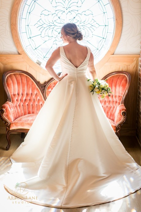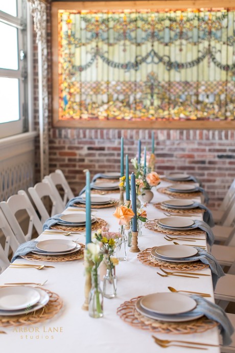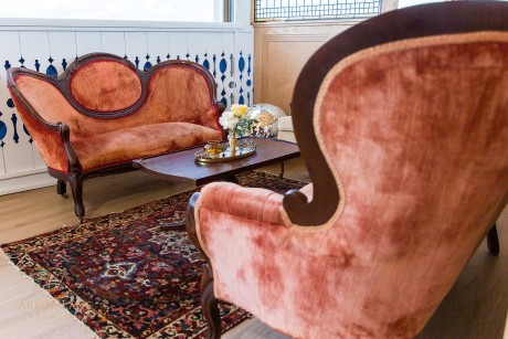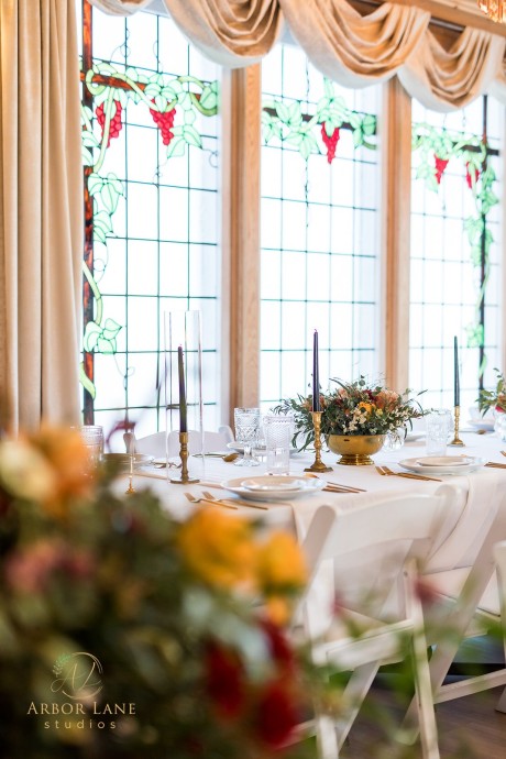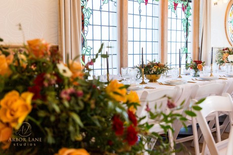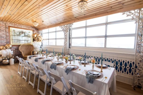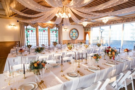 Also housed in the building is The Office. Reminiscent of an English pub, echoes of the above venue can be seen in more stunning stained glass, opulent chandeliers, and bay front windows. This space is ideal for wedding day prep, rehearsal dinners, and small dinner parties.