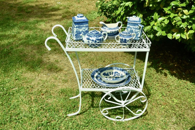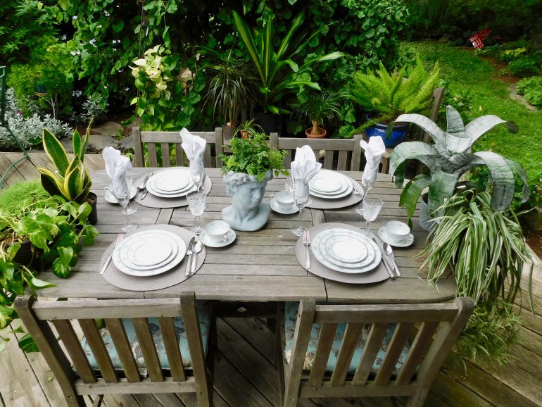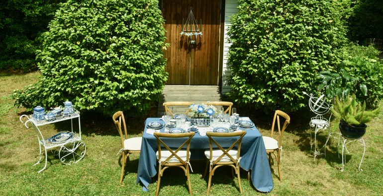 Everyone has a friend or a relative who is a collector. For this table, we borrowed the blue willow collection of Jane Meleady, who has been collecting this china for more than 40 years. The contrast of cobalt blue and white makes a bold statement. You could add silver or pewter pieces easily to this for even a more formal look. Look around the yard for decorative pieces like metal tables or sculptures, pillars and of course plants and flowers. Arrange throughout the yard to give some borders to your outside room. Your mom or grandmother would love to see you using their china, and if there is not enough, you could even mix and match several different patterns that use the same colors or even different colors, borrowing from several different family members.