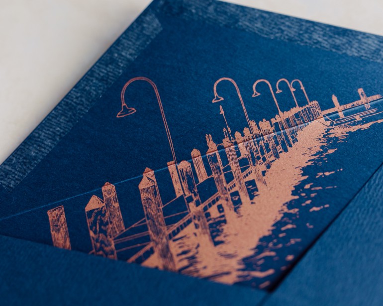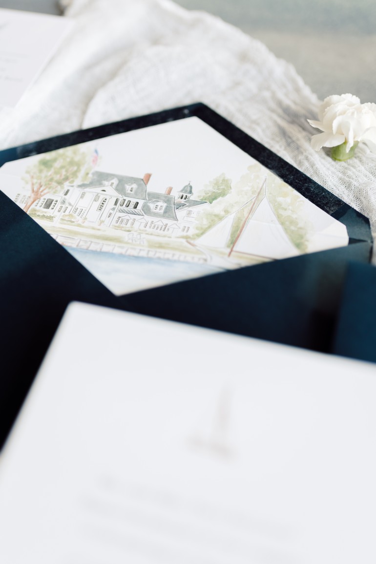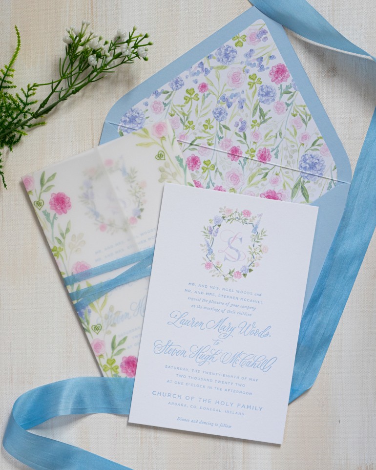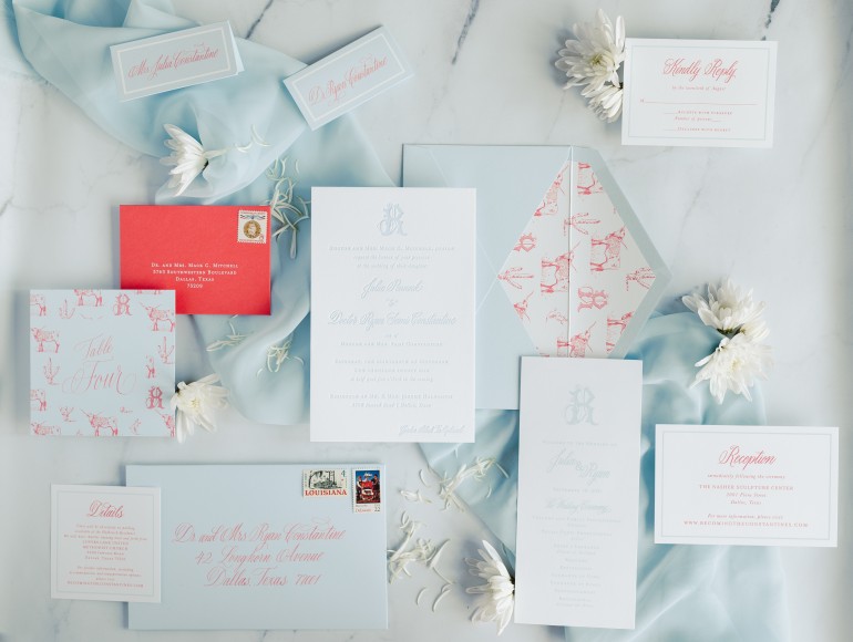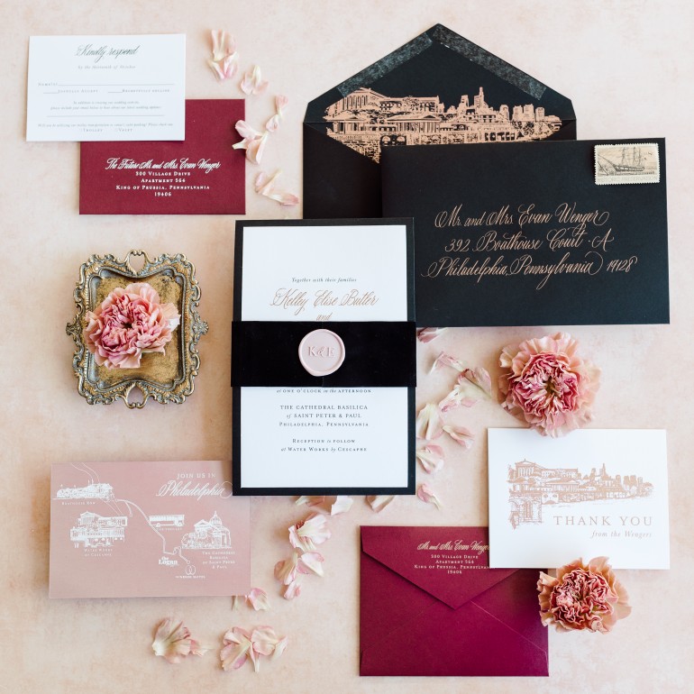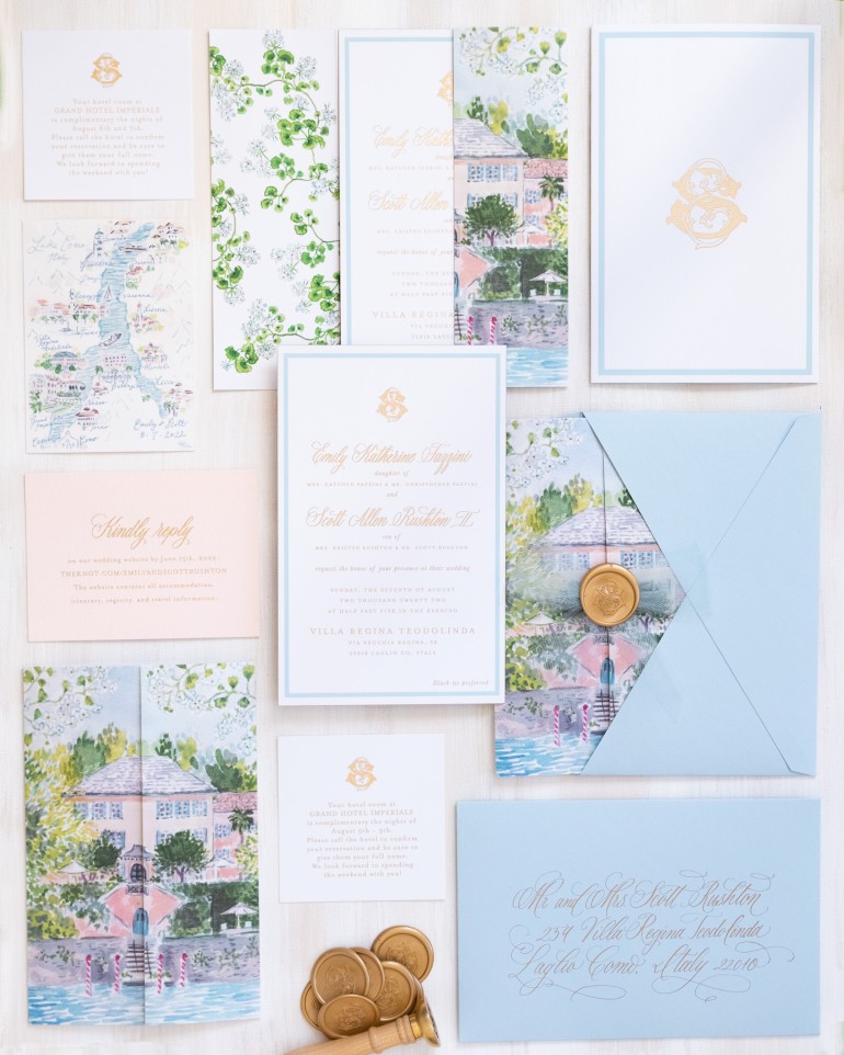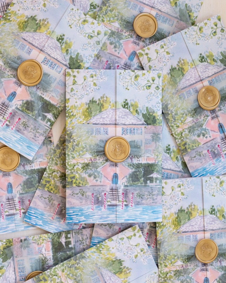 A full invitation suite includes five pieces—the invitation and its outer envelope, details, the rsvp card and a return envelope. Popular paper choices are mostly matte, occasional shimmer, and letterpress on matte cotton. Favorite embellishments include curated vintage stamps, envelope liners, and edge painting.