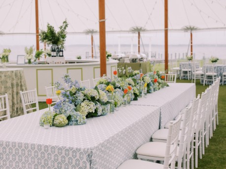 “By the time the marriage ceremony started at 4 pm on Saturday in the packed “Little Church by the Sea,” Westminster Presbyterian Church, the wind was gusting to 40 mph. This was a challenge but made for some epic photos, captured by the talented Mark Boatright.” Afterward, the iconic Jolley Trolley transported the wedding party to the Rehoboth Beach Country Club for cocktail hour and a tented reception. The cocktail hour, in the upstairs ballroom and balcony, overlooked Rehoboth Bay. Even though howling winds them to put down the sides of the fabulous cloth tent for the reception, it was everything Sarah and Andrew dreamed of. “Inside [there was] a gorgeous 16’ circular bar, custom built to match the greens and blues of our palette, displayed an array of beverages with florals, custom matchbooks, and personalized frosted cups flanking each side.” Guests danced all night long to the music of the Dexter Lake Club Band. The Bride and Groom chose to dance their first dance to the song “Best Friend” by Queen. The father/daughter dance was a mix of 4 songs: “Here, There and Everywhere” by The Beatles, “What is Love” by Haddaway, “Never Gonna Give You Up” by Rick Astley, and “Isn’t She Lovely” by Stevie Wonder.