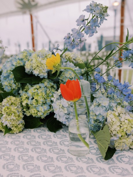 At the end of the reception, Andrew and Sarah exited through a tunnel of waving, light blue ribbon wands, as a trumpeter led the two out to the tune of “All You Need is Love” by the Beatles. Shuttles then took guests to meet the newlyweds at the Rusty Rudder for ongoing celebration!