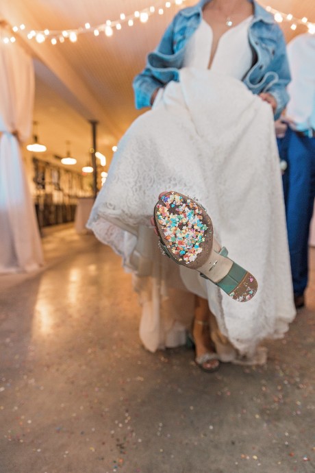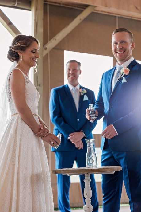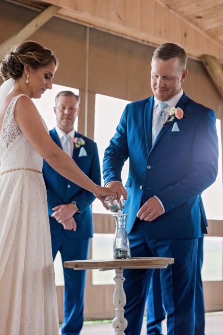 The couple performed a glass pouring ceremony, and later had a beautiful ornament and vase hand blown from the glass chips that were poured together.