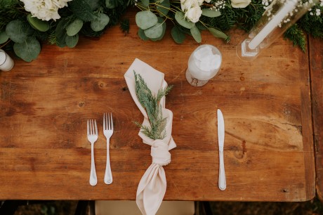 • Winter — Serve your guests spiked hot cider (for the adults) and offer a soft wrap to keep toasty on foggy, mysterious days. Reflect the natural rich greens and warm browns of the season in your palette for an opulent winter touch.