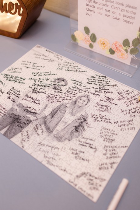 "We had so much fun incorporating the things we love into our wedding in small or big ways, and it just made it so meaningful. For example, I love puzzles and Ted and I will often do them, so having puzzle piece wedding cake toppers and a puzzle as a guest book just made it feel like we were being unapologetically us."