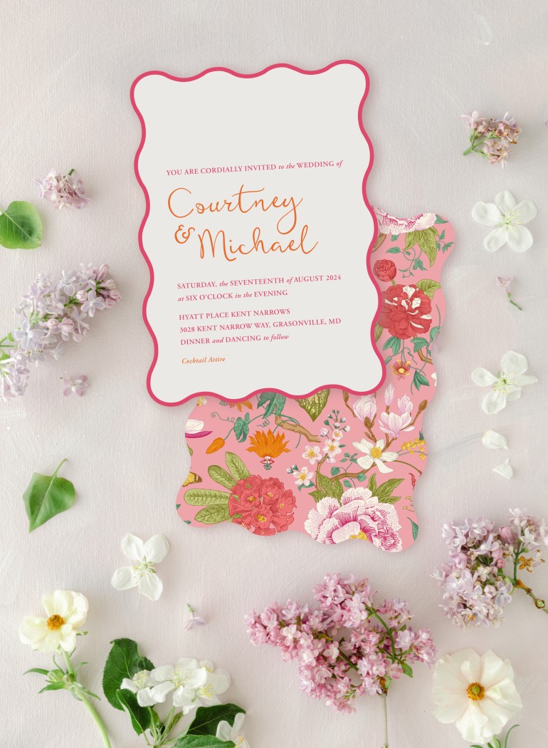 One of the most exciting trends is the rise of curved and wavy shapes in invitations, moving away from traditional rectangular forms. Playful wedding stationery with squiggles and scribbles is a trending design choice for 2024. Hand-drawn curves and fonts, doodle-like elements, and bold colors create a fun and whimsical feel. These unexpected trim lines add a touch of playfulness, perfect for couples looking to infuse fun into their wedding theme. This trend complements laidback, creative weddings and is expected to grow even more popular in 2025.