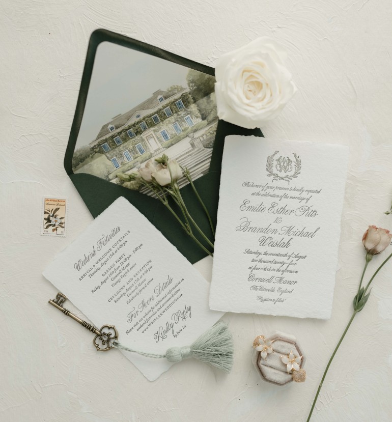 Handmade paper and deckled edges are making a significant impact in 2024. This trend harkens back to old-world beauty and elegant romance, reminiscent of past eras. Invitations made from handmade or seed-filled (plantable paper) are not only eco-friendly but also offer an understated elegance with timeless appeal. These letterpress invitations, featuring vintage monograms, watercolor venue illustrations, or fine art paintings on envelope liners, are perfect for couples seeking a blend of historical charm and environmental consciousness.